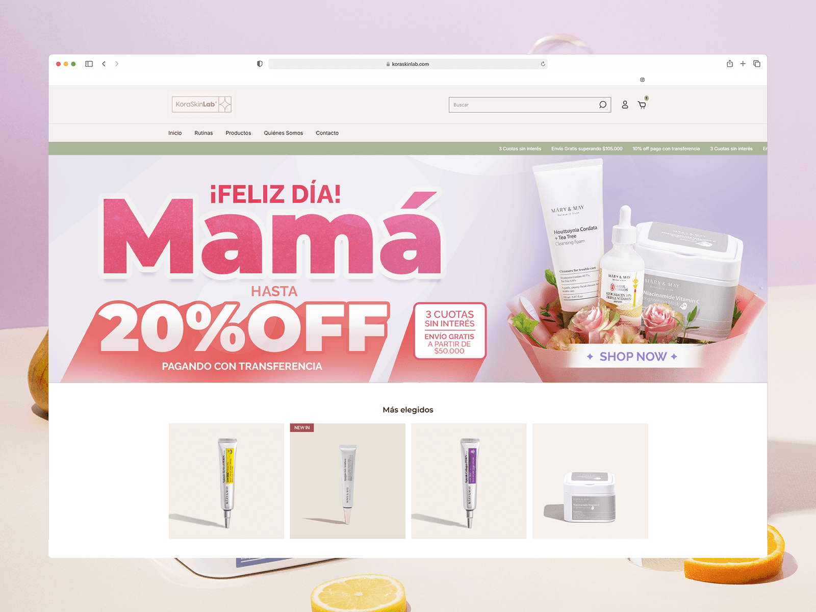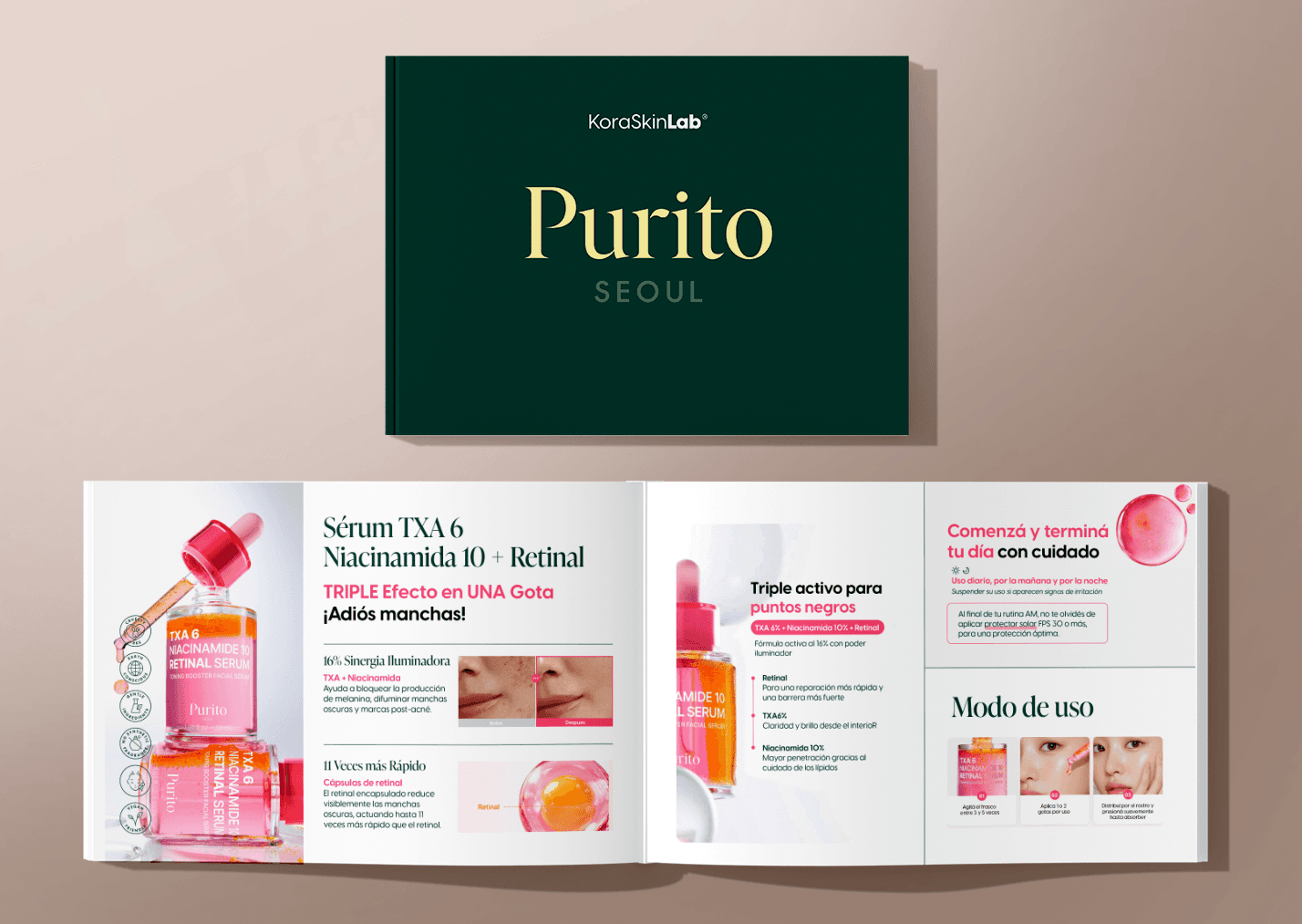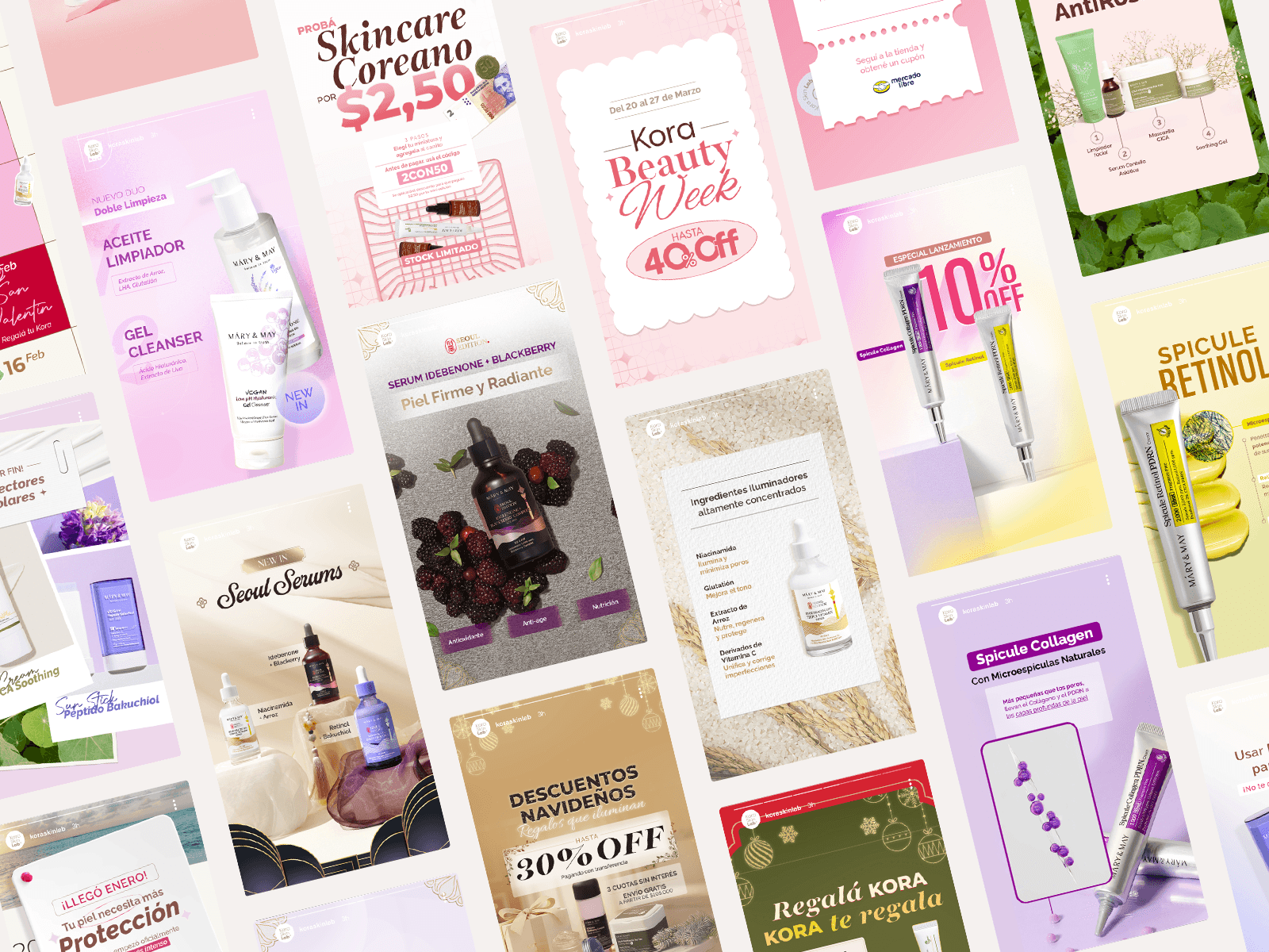 KoraSkinLab is an Argentine brand founded in 2025 to bring premium Korean cosmetics closer to the local market. The brand specializes in a high-quality selection of products, including renowned names like Mary & May, VT Cosmetics, and Purito. The goal was to translate this K-Beauty essence into high-impact commercial assets that effectively differentiate each brand within their stock.
